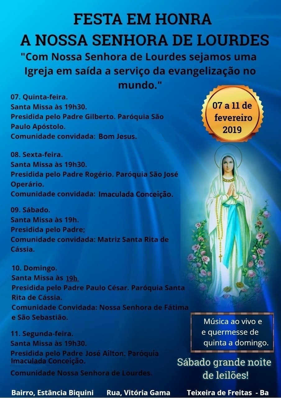 A Igreja Matriz de Nossa Senhora de Lourdes está localizada na Rua Vitória Gama, Estância Biquíni, Teixeira de Freitas – BA. E todos os dias haverá música ao vivo e a quermesse de quinta a domingo. No sábado haverá a grande noite de leilões.