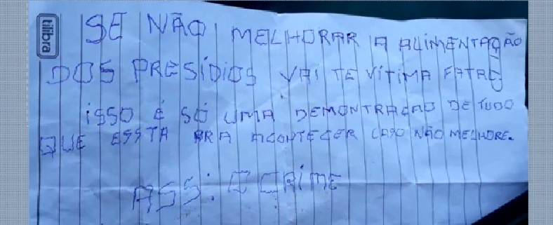 Depois do ataque, os criminosos ainda deixaram um bilhete, fazendo ameaças: "Se não melhorar a alimentação dos presídios vai ter vítima fatal. Isso é só uma demonstração de tudo que está para acontecer caso não melhore".