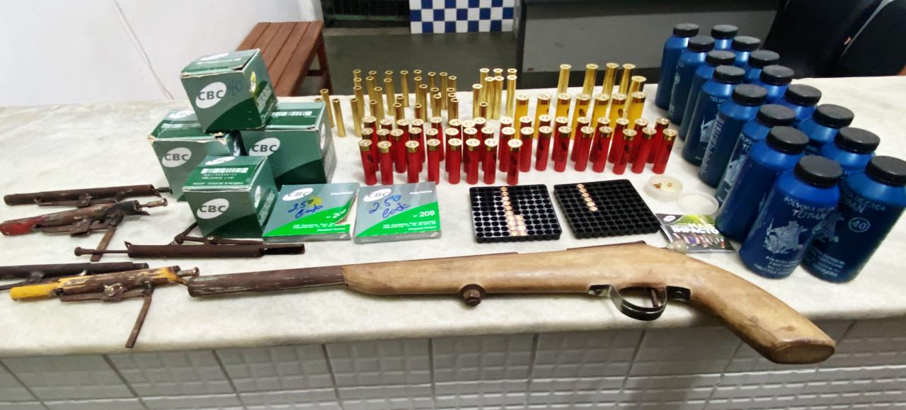 A viatura se deslocou até o comércio indicado onde os policiais aprenderam mais munição, estojos e espoletas. Em seguida, a guarnição foi até a do primeiro abordado e lá apreendeu uma espingarda de fabricação caseira.