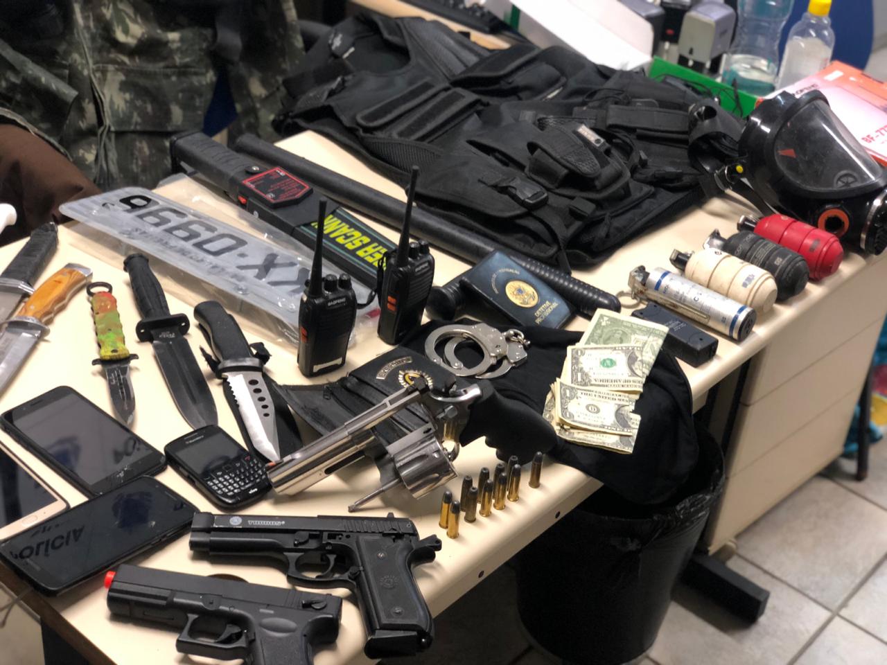 Na casa do suspeito foram encontradas quatro granadas, duas réplicas de pistolas, seis facas, uma arma de choque, 11 munições calibre 38, uma tonfa, um detector de metal, uma máscara de gás, uma capa de colete antibalístico, uma máscara tipo brucutu, um uniforme camuflado, dois rádios comunicadores, carregadores, uma algema e as quantias de R$ 25 e U$ 20 dólares.