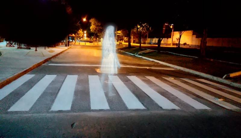 “O pessoal estava pintando a faixa de pedestre e quando foi tirar a foto apareceu o fantasma” diz a mensagem que tem circulado nas redes sociais.