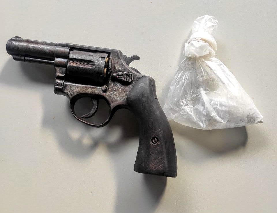 Foi feito a abordagem e durante a vistoria os policiais encontraram em poder de Pedro dos Santos Garcia, o "Pedrinho", um revólver calibre 38 e uma porção de um pó branco análogo a cocaína.