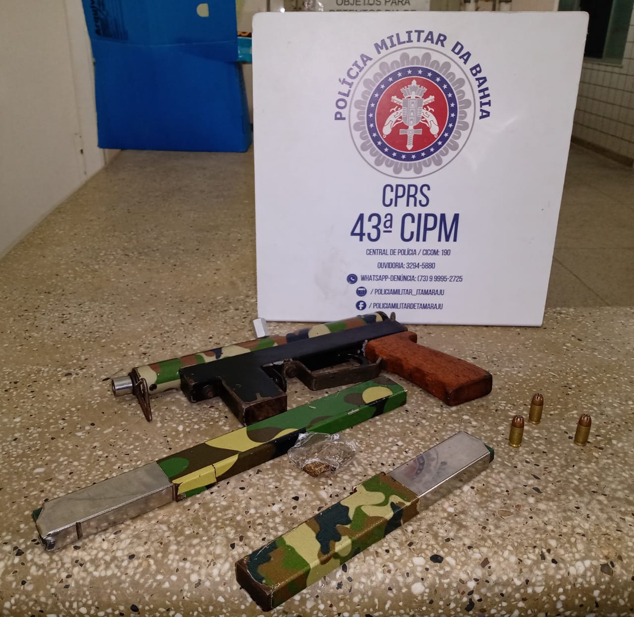 Na abordagem seguida de busca pessoal, a guarnição encontrou com o suspeito uma bucha de maconha. Em seguida, a guarnição deslocou-se até a casa do abordado, onde a policia apreendeu uma submetralhadora calibre .380, com três munições intactas.