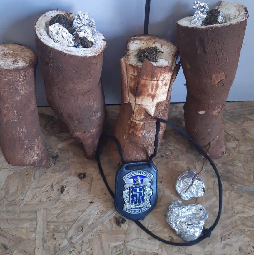 Uma mulher de 26 anos foi presa em flagrante, na quinta-feira (4), quando tentou entrar na Delegacia Territorial (DT) de Santa Maria da Vitória, transportando maconha dentro de raízes de mandioca.