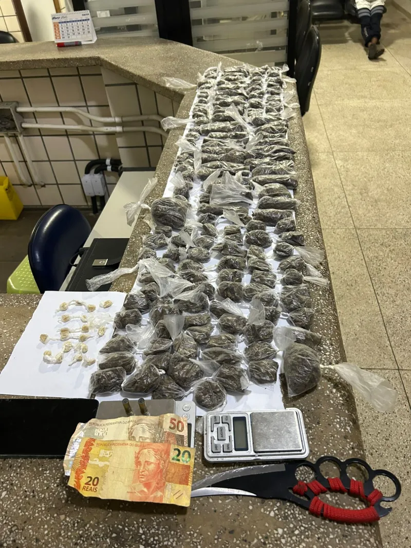 Após consulta aos sistemas de segurança, constatou-se a existência de um mandado de prisão em aberto contra Andreyson Adão Silva, o "Neguinho" de 19 anos, natural de Vila Portela, distrito de Ibirapuã. Em varredura no perímetro, a guarnição localizou a sacola dispensada contendo substâncias análogas a maconha e crack. Questionado, o indivíduo relatou residir no município há cerca de um mês, atuando na distribuição de entorpecentes a mando de terceiros.