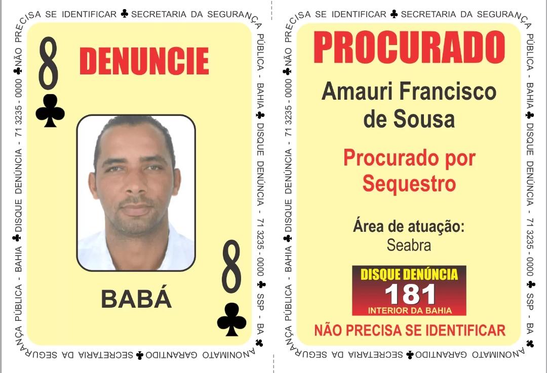 O sequestrador e suspeito do homicídio do delegado Marcos Antônio Torres, em abril de 2018, Amauri Francisco de Sousa, o 'Babá', 'Oito de Paus' do Baralho do Crime da Secretaria da Segurança Pública, foi localizado durante uma operação conjunta, realizada na madrugada desta quinta-feira (21), no município de Utinga, região da Chapada Diamantina.