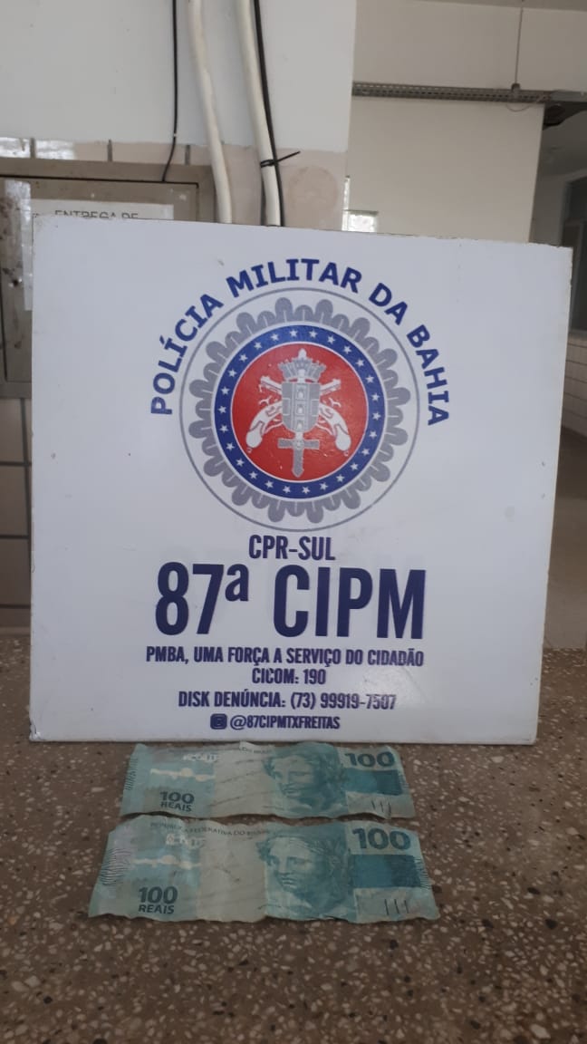 Policiais da 87ª Companhia Independente de Polícia Militar prenderam, na manhã deste sábado (1), em Teixeira de Freitas, um homem com duas células falsas de R$ 100.
