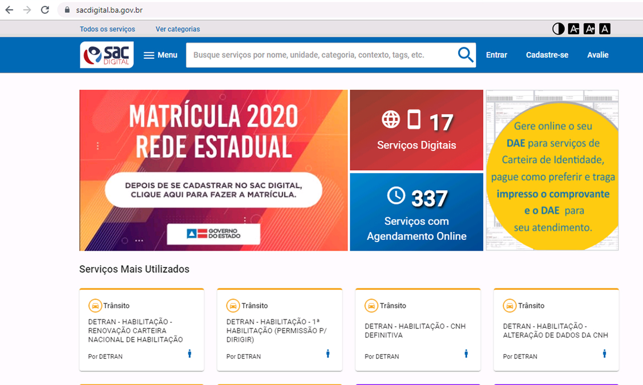 Uma parceria entre a Secretaria da Educação, a Secretaria da Administração (Saeb) e a Companhia de Processamento de Dados do Estado (Prodeb) permite que os alunos da rede estadual façam a matrícula para 2020 por meio do SAC Digital (www.sacdigital.ba.gov.br). A plataforma do Serviço de Atendimento ao Cidadão (SAC) unifica os serviços do Estado utilizando diferentes canais de comunicação, como computadores, tablets e celulares.