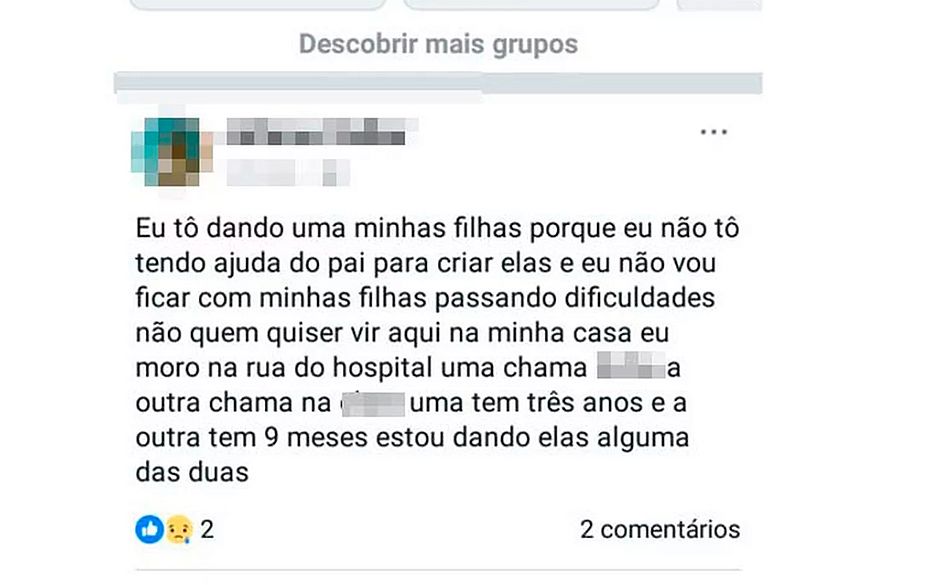 Uma mulher anunciou a doação das filhas, de 3 anos e outra de apenas 9 meses, em um post no Facebook, na segunda-feira (15), em Mundo Novo, interior baiano. Na terça, ela fez novo post afirmando que se arrependeu depois de conversar com o Conselho Tutelar da cidade.