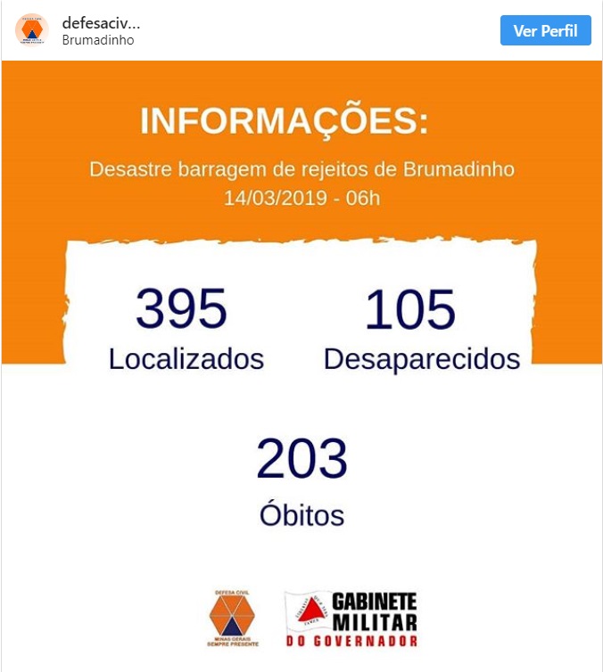 A Defesa Civil de Minas Gerais informou nesta quinta-feira, 14, que o número de mortos pelo rompimento da barragem da mina Córrego do Feijão, da mineradora Vale, em Brumadinho, na região metropolitana de Belo Horizonte, ocorrido há quase dois meses, subiu para 203.